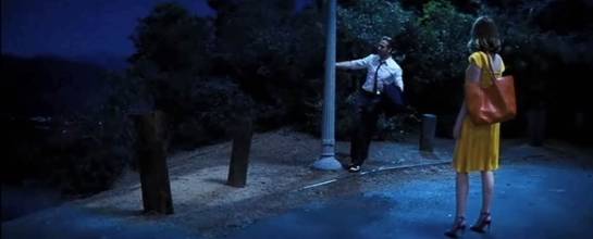石头姐和高司令两人在公园尬舞的场景除了致敬《雨中曲》外,还致敬了1937年拍摄《随我婆娑》,两人借助一条公园的长凳,表现出一场真正意义上“灵与肉”的交流。同时,在公园长凳前的舞蹈,则借鉴了1953年的《蓬车队》。