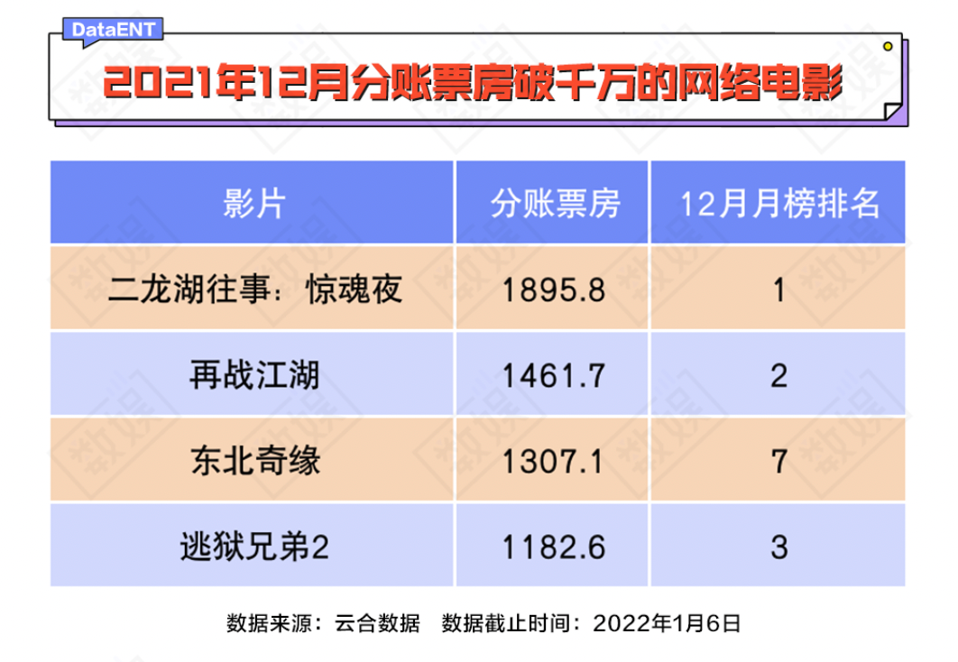 21年12月分账票房top1的网络电影是在爱奇艺、腾讯视频、优酷三家平台拼播的《二龙湖往事:惊魂夜》,截至1月6日,其分账票房共计1895.8万元。同时,该片借力“二龙湖”系列的ip效应、多平台上映的优势,摘得2021年12月网络电影月榜冠军。
