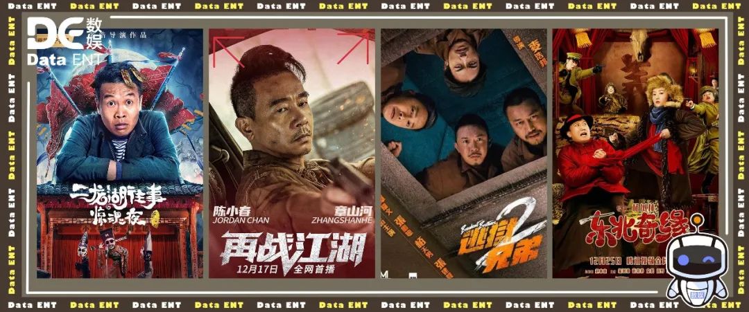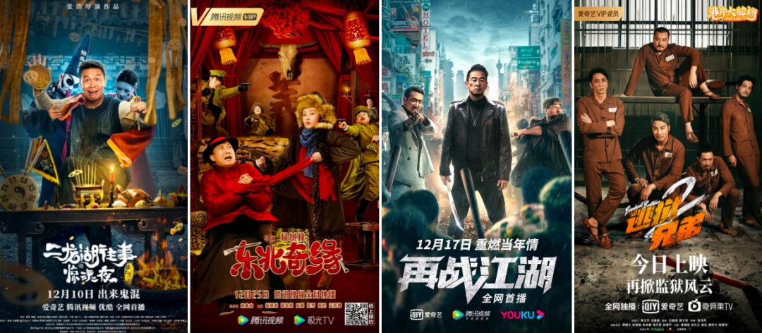 而上映于12月24日的《逃狱兄弟2》和12月25日的《东北奇缘》,两者均为平台的独播项目。虽然上映天数不长,但也跻身进入了12月网络电影月榜的top10,分别位列第3名、第7名。