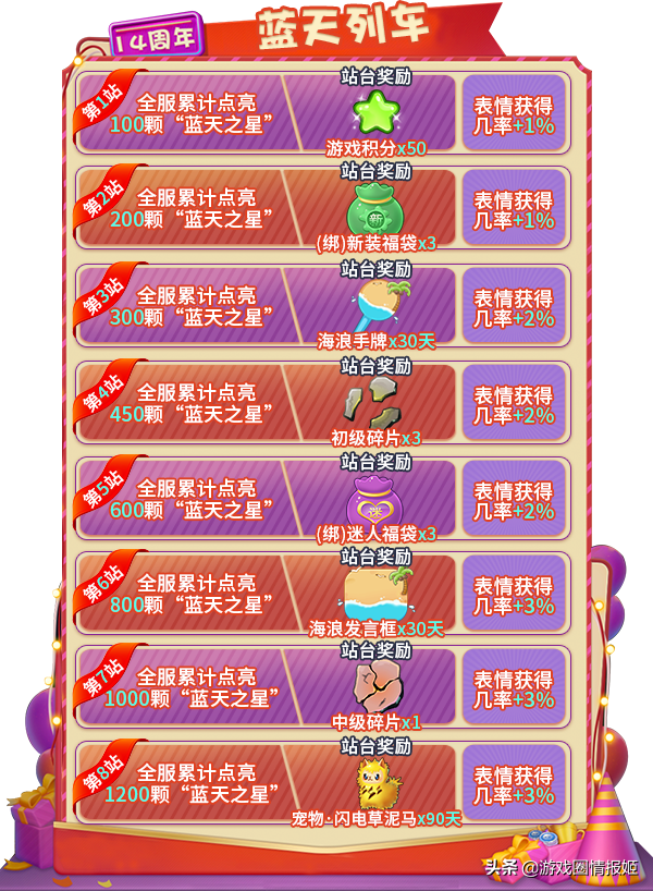 蓝天列车:活动期间累计充值108金币即可解锁,并点亮1颗“蓝天之星”,根据全服“蓝天之星”的点亮数量,解锁奖励。