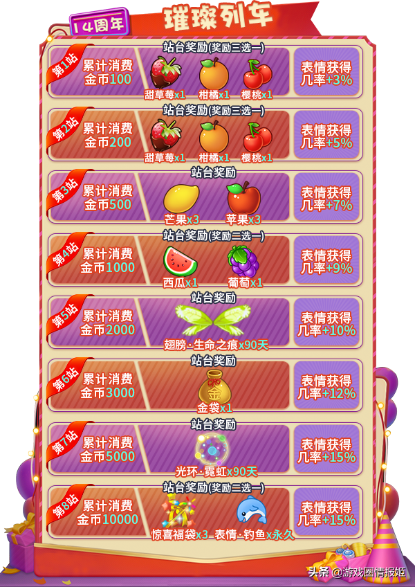 璀璨列车:活动期间,消费的金币越多,可获得的奖励越多!