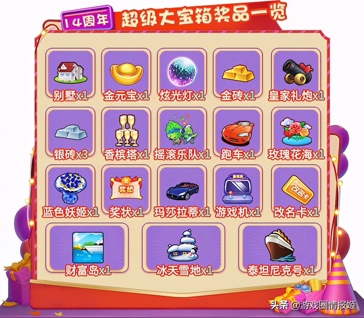探寻独属你的宝藏吧!活动期间,在16个奖励格中定义你喜欢的奖励后,花费10金币开始与幸运女神约会吧!。