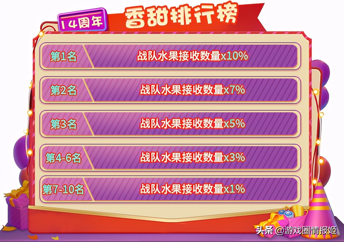 奖励二:活动结束后,各个水果战队内积攒“香甜点数”最多的前10名玩家将获得“香甜排行榜”奖励,根据您接收的各种水果数量进行返利!