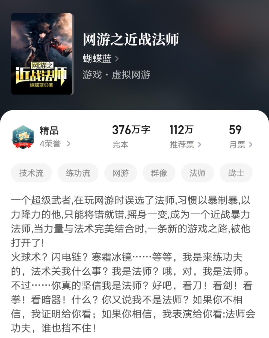 《网游之近战法师》是蝴蝶蓝的第三本完本小说,也是他的成名作品。