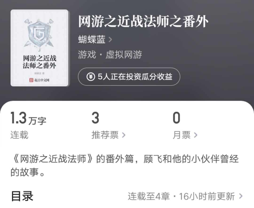就在今天,九月二十二号,蝴蝶蓝在起点上传了近战法师的番外新书。书名很直接,就叫做《网游之近战法师之番外》。