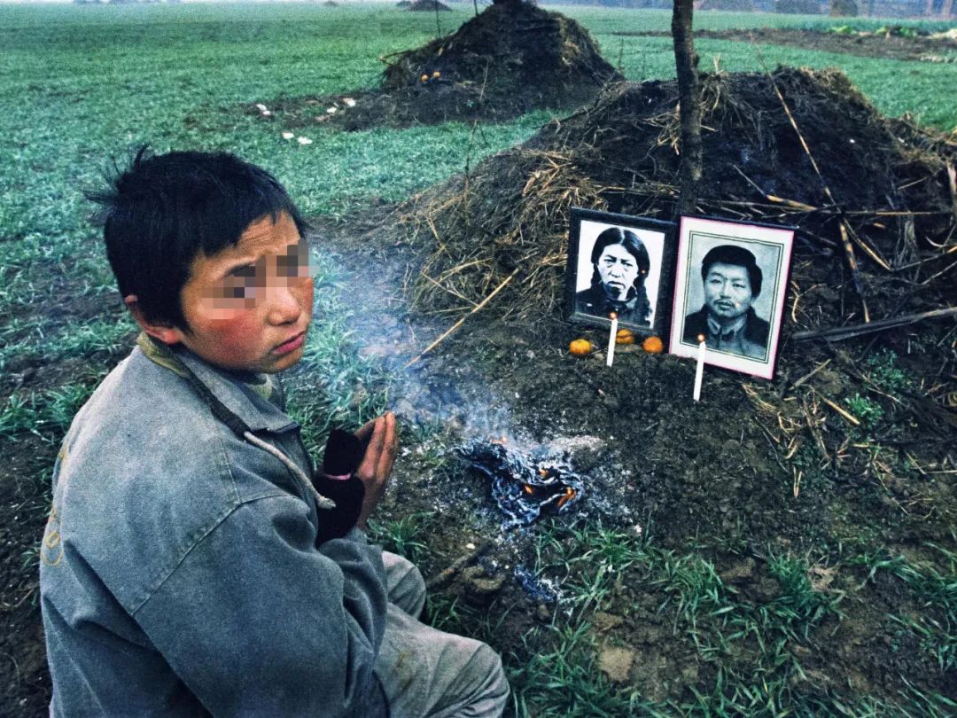 河南上蔡的艾滋病村,一名孩童在坟前悼念逝去的亲人。摄影/卢广