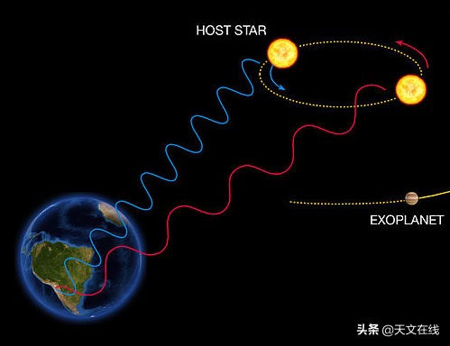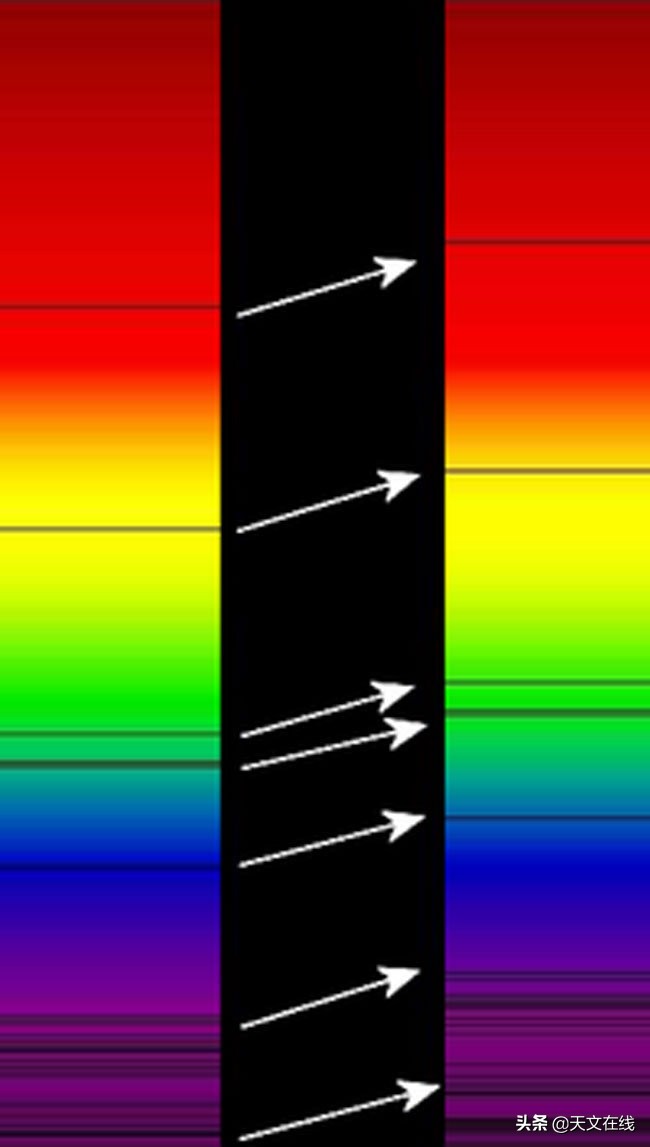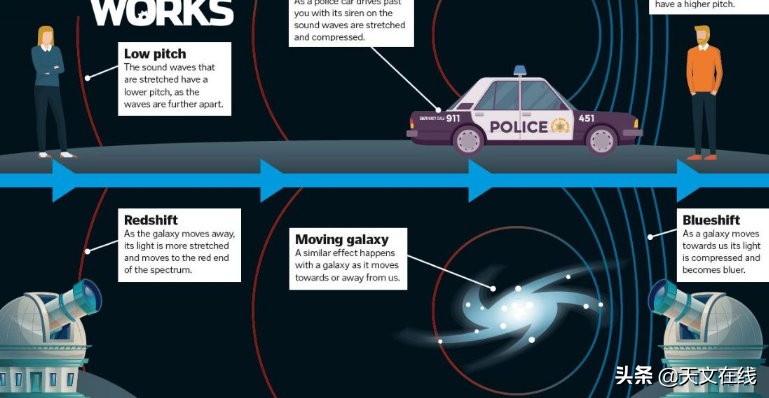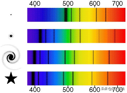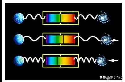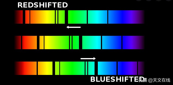 光也会有同样的多普勒效应。当物体朝我们移动时,波长会发生变化,向光谱的蓝色一端移动。当物体从我们身边移开的时候,光被“拉伸”向红色,我们可以观察光谱线中的移位现象。