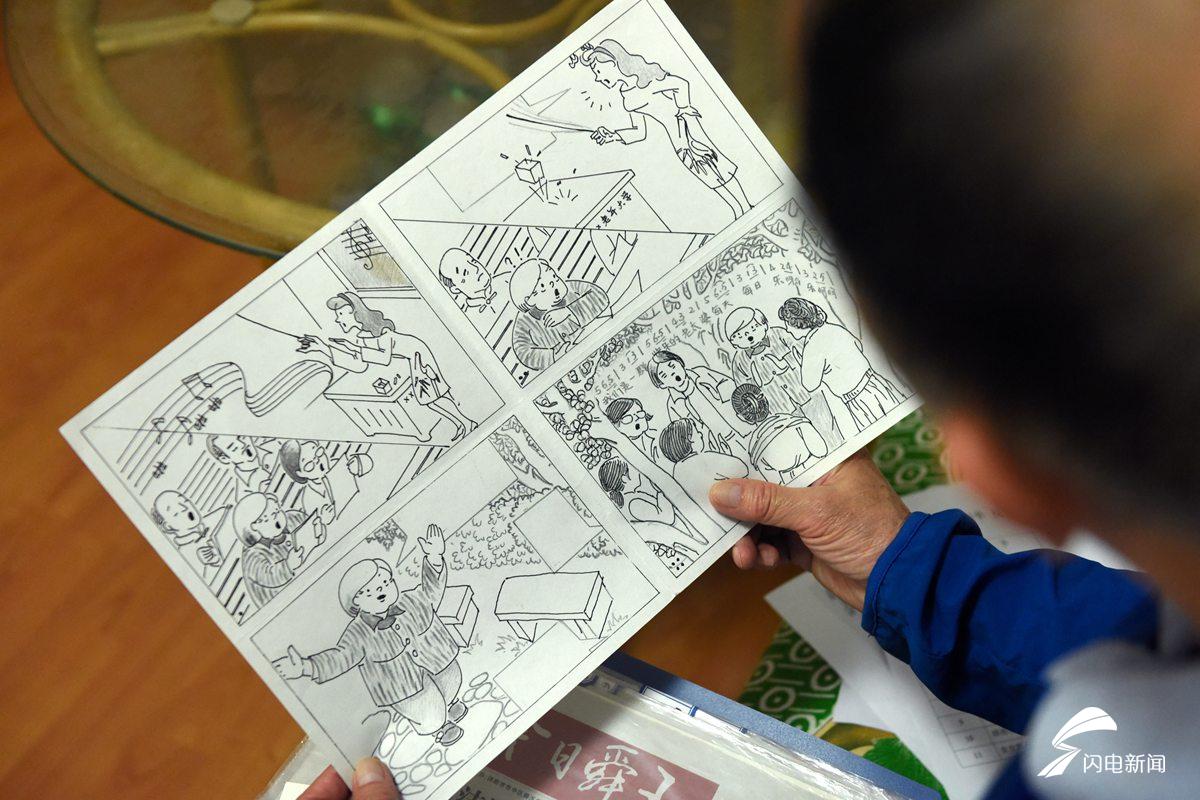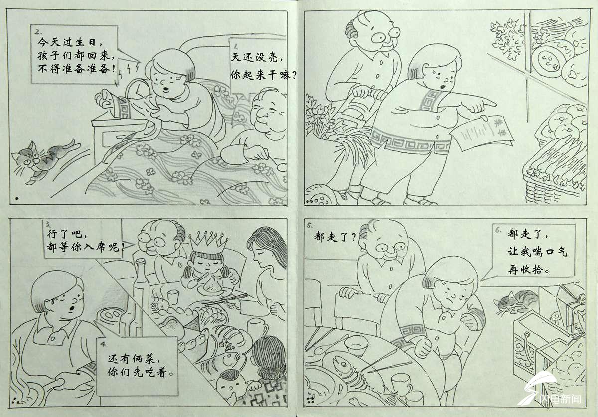 吴国梁画的都是他们生活中经历过的事,他说,每次给老伴儿看新作品,虽然不表达什么,但她内心总是很感动的。