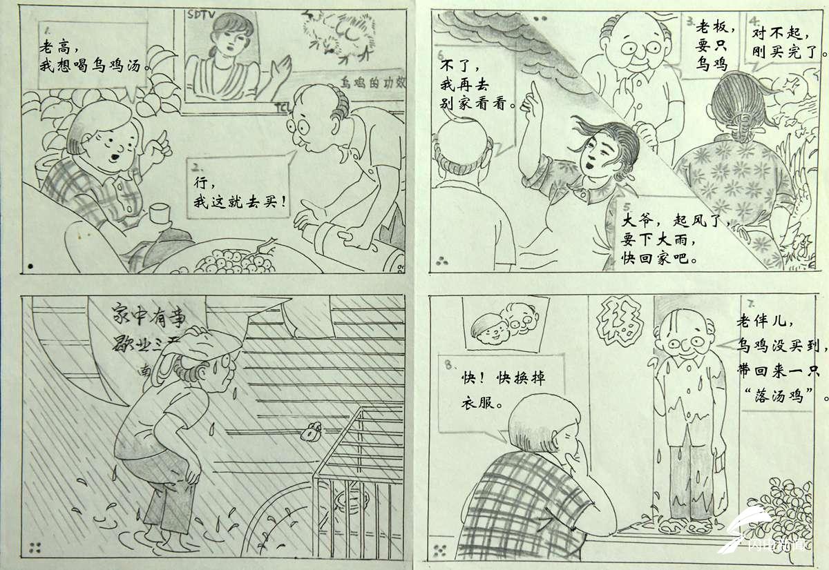 图为漫画作品《乌鸡》。吴国梁在每一篇漫画后都描述了一段他的见解:大伙可记得7月份那场突如其来的暴雨,我每每想到它,心里就暖暖的。那天,开门的一瞬间,我记住了老伴的眼神,有怨、有痛、有爱。哇!我感到了家中有个牵挂你的老伴真幸福!
