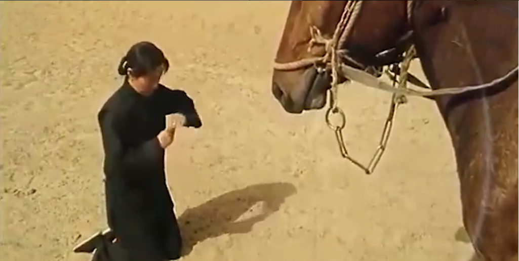 新娘这时却好奇地揭开盖头张望,土匪看见了她,二话不说,跳下马就冲了过去。