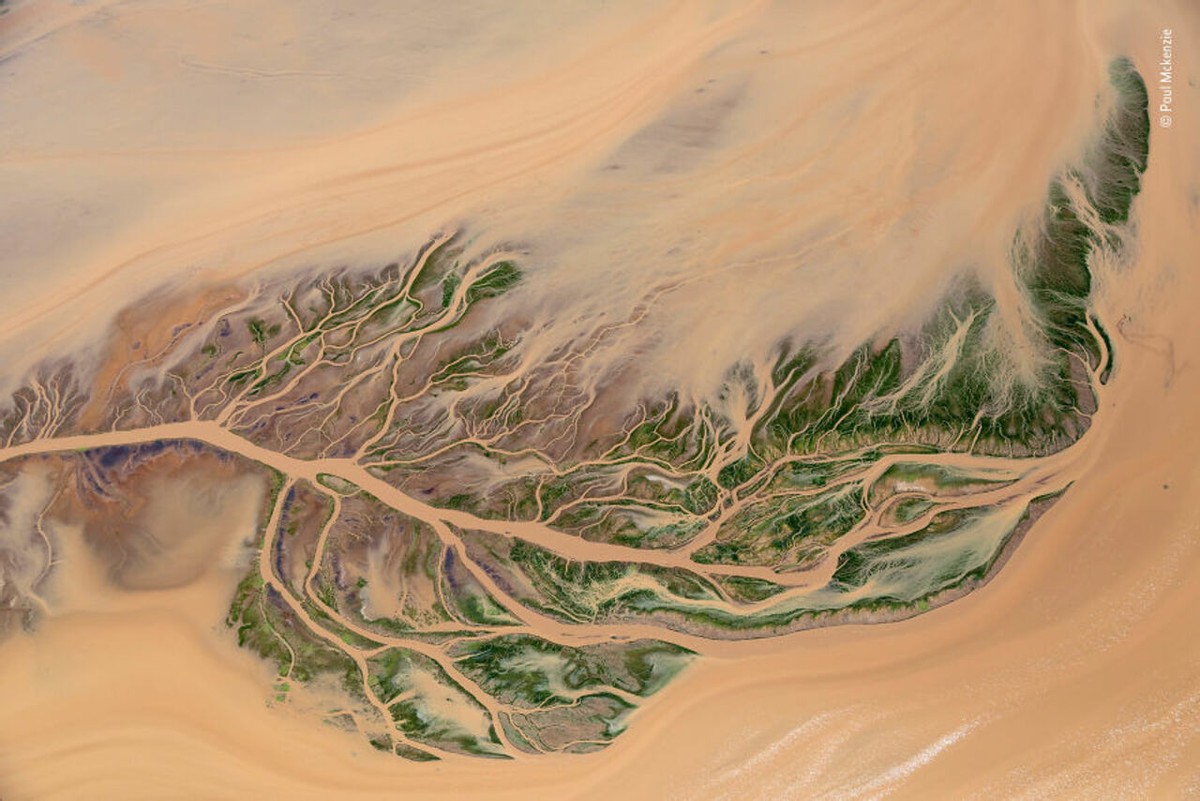 “我喜欢把自然描绘成艺术的图像,”保罗说。乍一看,你可能会认为这是一个蕨类植物的图像。但它实际上是一个错综复杂的河流三角洲。当他的小飞机最后一次飞过现场时,保罗通过敞开的门拍摄了他的照片,与湍流作斗争,捕捉大自然的淤泥和水成分。南部的埃瓦索·恩伊罗河向南流经肯尼亚,流入纳特隆湖富含盐的水域,纳特隆湖是数十万只小火烈鸟的主要繁殖地。这些鸟依靠河水来饮用,并从羽毛中清除高盐的湖水。