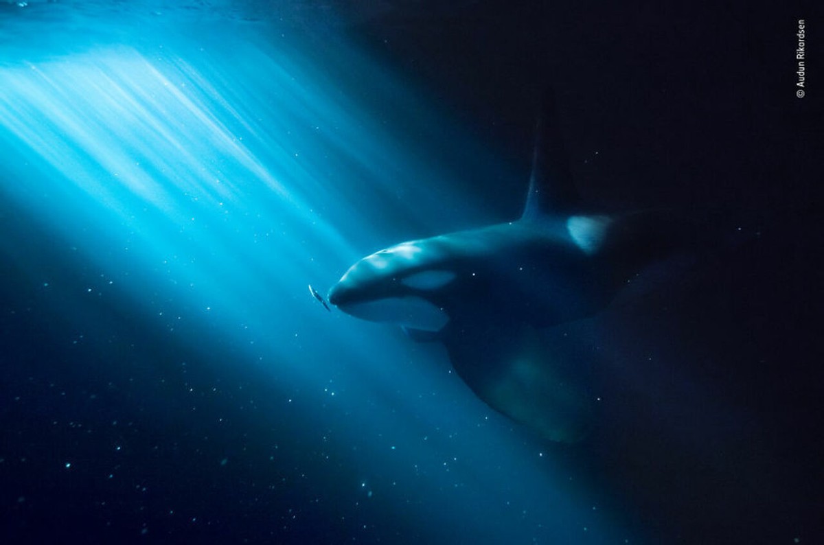 大量鲱鱼在北部峡湾越冬,吸引了数百只捕食者和夜间渔船。虎鲸意识到渔网被拉起的声音意味着一顿轻松的晚餐的可能性。奥顿要求渔民将他们最强的光线射入水中,以捕捉他的照片。虎鲸是海豚家族中最大的成员。虽然是一个物种,但现在人们认为有几个物种生活在不同的地区,使用特定的狩猎策略和社会结构。这是一种雄性北大西洋东部形式,已知与其他虎鲸一起工作,将鱼群放入密集的浅滩。