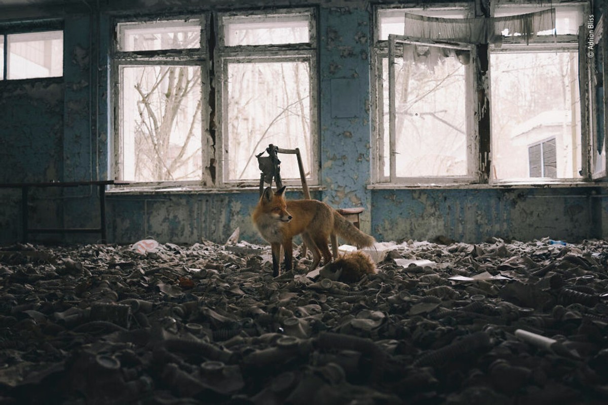 普里皮亚季市被毁被抢,位于1986年核灾难后建立的切尔诺贝利禁区内。由于没有人类,这座城市已经向大自然投降了。这只红狐狸小跑着走进废弃的教室,在儿童大小的防毒面具地毯上短暂停留,时间刚好够一张照片。阿德里安说,看到这一切“完全出乎意料”。切尔诺贝利灾难的长期影响还远未明朗。但是,在没有人类的情况下,普里皮亚季似乎正在茁壮成长。森林侵占了城市的四面八方,助长了野猪、海狸、水獭、鹿和驼鹿。由于辐射水平仍然很高,只有时间才能证明这种自然再生是否是这个荒凉地方的希望迹象