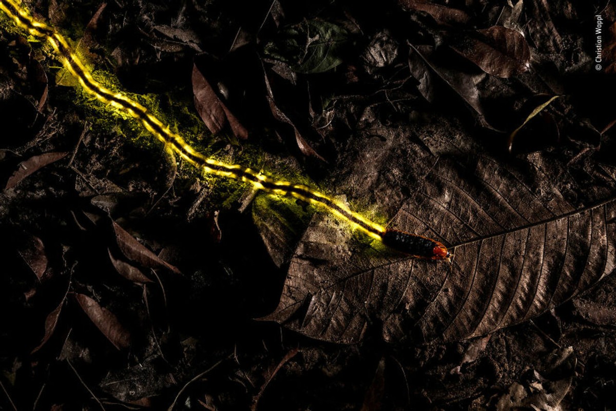 到了凌晨一点,森林很安静,但它的夜生活从落叶中闪耀出来。这场表演的明星是一只长约7厘米的大型萤火虫幼虫,它从尾部的四个发光器官发出持续的光芒。克里斯蒂安用一道闪光长时间曝光,揭示了幼虫显然在燃烧一条痕迹。萤火虫一生中大部分时间都是幼虫,以蜗牛和蛞蝓等其他无脊椎动物为食。这只蜗牛是一种贪婪的蜗牛捕食者,甚至可以捕食比它大许多倍的蜗牛。它的发光是其光器官内化学反应的结果,很可能是对捕食者的警告,即它是不可口的。