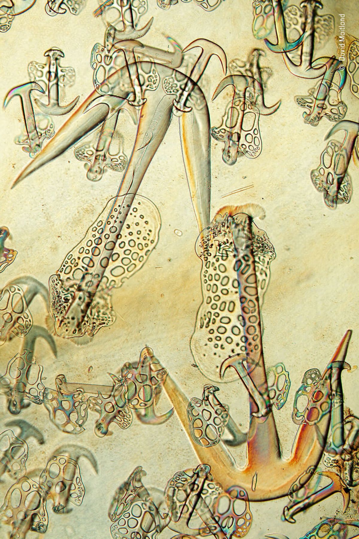 大卫从一张古老的博物馆幻灯片上捕捉到了这张高倍图像,使用了微分干涉对比度。照明技术被用来揭示显微标本的三维结构。出于对科学、自然和艺术的兴趣,大卫创作了它来吸引观众的注意力。他说,'我希望他们问这个问题:'那是什么?‘。这些类似于船的锚,是海参皮肤上微小的突起,被称为骨针。这些针状的结构是由碳酸钙形成的透明的、脆性的矿物组成的。它们保护这些海洋无脊椎动物的柔软身体,是区分众多海参物种的关键。