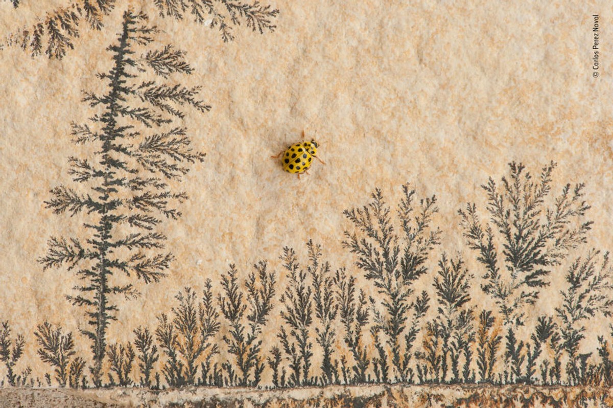 卡洛斯说,这种软锰矿石生长在一栋房子的低矮石墙上,看起来“就像宣纸上的东方绘画”。有些像树,有些像山。他蹲下捕捉这一幕,等了半个小时这只瓢虫游荡过来。对卡洛斯来说,这张照片“展示了当你停下来仔细观察时,小而普通的地方的美丽”。二氧化锰,也被称为软锰矿,是一种常见的矿物,当水从沉积岩的裂缝中渗出时。仔细观察就会发现软锰矿矿物散发出的微小裂隙,以自我重复的模式扩散开来。瓢虫有22个斑点,不寻常地以霉菌为食,而不是蚜虫。