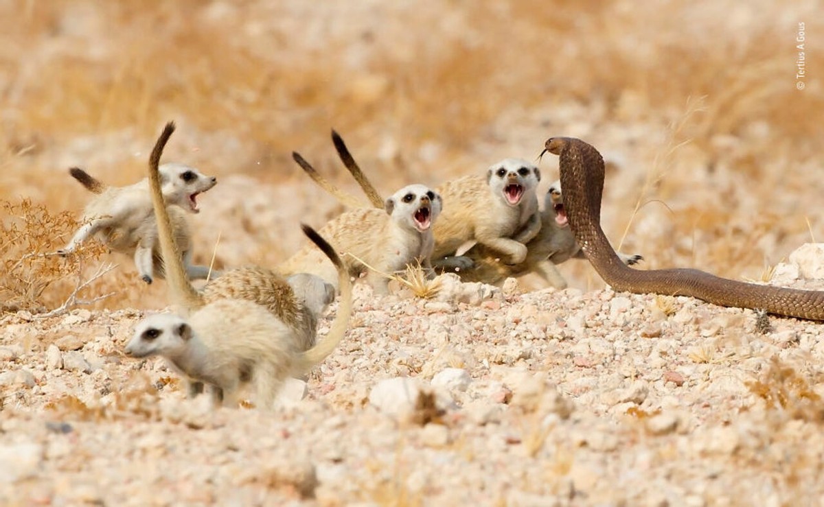 一条安基塔眼镜蛇抬起头,向两只猫鼬幼崽扑去。他们的20多人立即做出反应,跑回沃伦,分成两半,一半把小狗领走,另一半向蛇走去,咆哮着,把它们的外套弄松。专注于蛇的经典侧面,德丢斯捕捉到了猫鼬暴民的恐惧和侵略性。这一幕很少见--很少有安切塔眼镜蛇攻击猫鼬群的记录。在一个群体中,哺乳动物有优势,使用报警系统来通知其他捕食者,并协调攻击者的围攻。这条蛇只是一个投机取巧的猎人,想在这群人到来之前抢走其中一个。