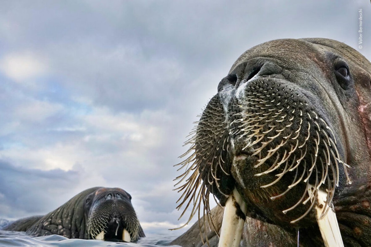 瓦尔特用两根独脚杆和一个浮子把相机伸向前方,滑入冰冷的水中,拍摄他从小艇上发现的海象。这引起了一些好奇的年轻人的注意,他们开始向他游来。瓦尔特被这次和平的相遇激动不已,从一根杆子的长度之外捕捉到了这幅亲密的肖像。这些海象可能会活长达40年,每天都在海底拖网捕鱼,用它们的胡须和嘴来寻找和提取食物。它们厚厚的皮肤保护它们免受寒冷,因为它们主要以软体动物为食,如蛤蜊。在北极的水中,流向皮肤表面的血液减少以保持热量。