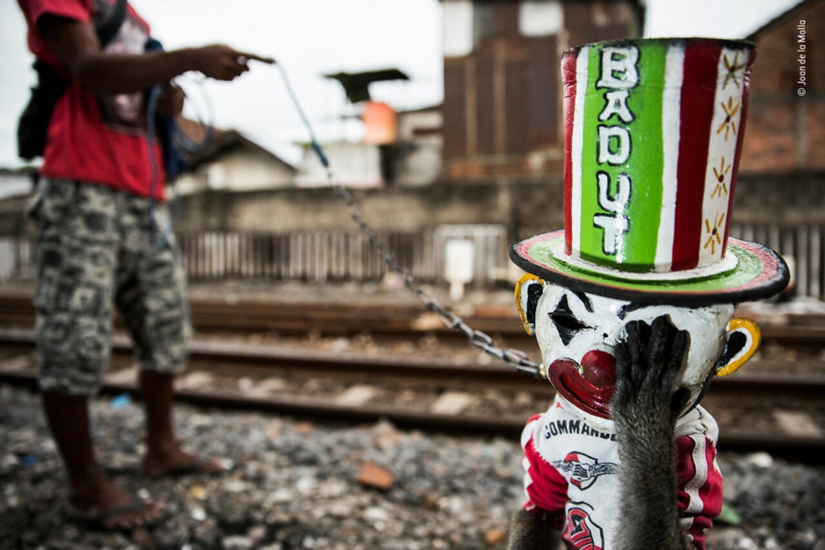 一只长尾猕猴timbul把手放在脸上,试图缓解口罩的不适,同时被训练直立进行街头表演。像这样的景象在印度尼西亚很常见,琼花了很长时间来获得猴子主人的信任。她说,他们不是坏人。大多数人赚钱送孩子上学。像廷布尔这样的猕猴生活在糟糕的条件下,被剥夺了它们茁壮成长所需的社会关系。他们工作许多小时,跳舞和骑自行车,这些动作不自然和不舒服。动物慈善机构正在努力执行立法,规定未经许可从野外带走幼猴或交易它们是非法的。
