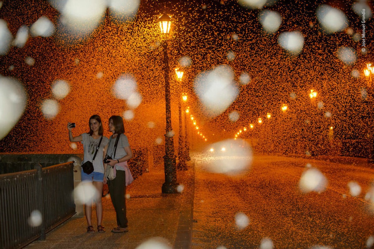 当黄昏降临到埃布罗河上时,一团厚厚的蜉蝣飞到桥上。这些昆虫被耀眼的灯光迷惑了,把它误认为是水,在黑暗的沥青上产卵。在空气放晴之前,何塞只有几分钟的时间来记录这一现象--留下了一张注定要死的卵和废弃的尸体的地毯。雌性成年蜉蝣从幼虫体内出来后,在死亡前只有几个小时的时间产卵。桥上的灯光可能会扰乱它们的航行,虽然这种现象对游客来说可能是一种奇观,但对蜉蝣来说,人工灯光的影响具有毁灭性的后果。