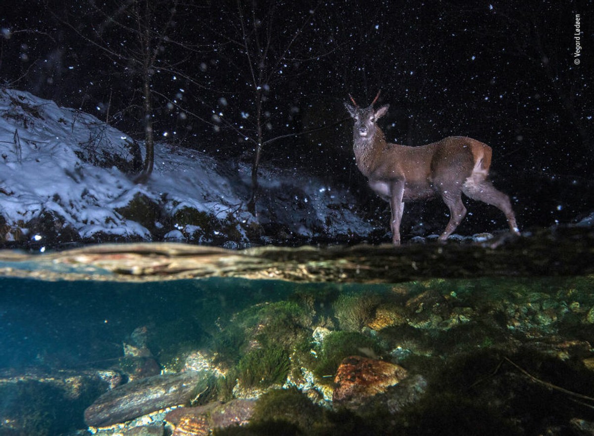 维加德说:“当我拍下这张照片时,梦想成真了。”经过多年的寻找,他终于找到了一个河边的地方,瓦尔达尔的鹿曾到访过。在将相机部分浸没在防水箱中后,他在水面上和水下设置了闪光灯,以及运动传感器。接近午夜时分,一只雄性过河--摄像机捕捉到了它骄傲的姿态。马鹿是仅次于驼鹿的最大鹿种。只有雄性有鹿角,已知鹿角长到一米多长,重达五公斤。每年冬天结束时,它们会脱落它们的鹿角,鹿角是由骨头制成的--当春天来临时,它们会重新生长,由一种被称为天鹅绒的柔软覆盖物保护。