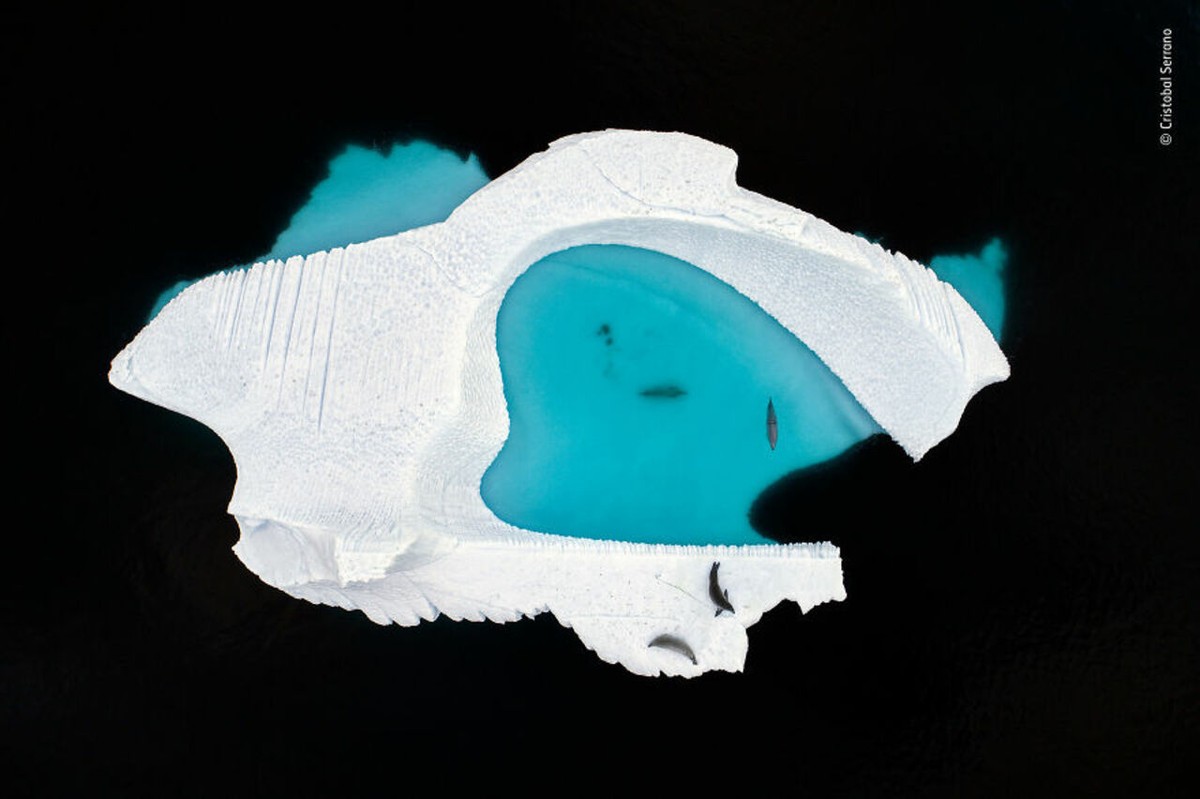 克里斯托瓦尔解释说:“人类试图掌握雕塑艺术,但冰山向我们表明,我们无法与大自然伟大的设计相媲美。”为了展示这壮观的冰雕之美,他使用了一架低噪音无人机,把它飞得很高,以免打扰海豹。鸟瞰图显示冰山中心有一个心形的水池,蟹海豹主要从黄昏到黎明觅食,中午左右拖到冰上休息。这张图片中的蓝色区域是冰山在水线以下融化的地方,形成了一个小而浅的水池,与深邃而黑暗的海洋形成鲜明对比。