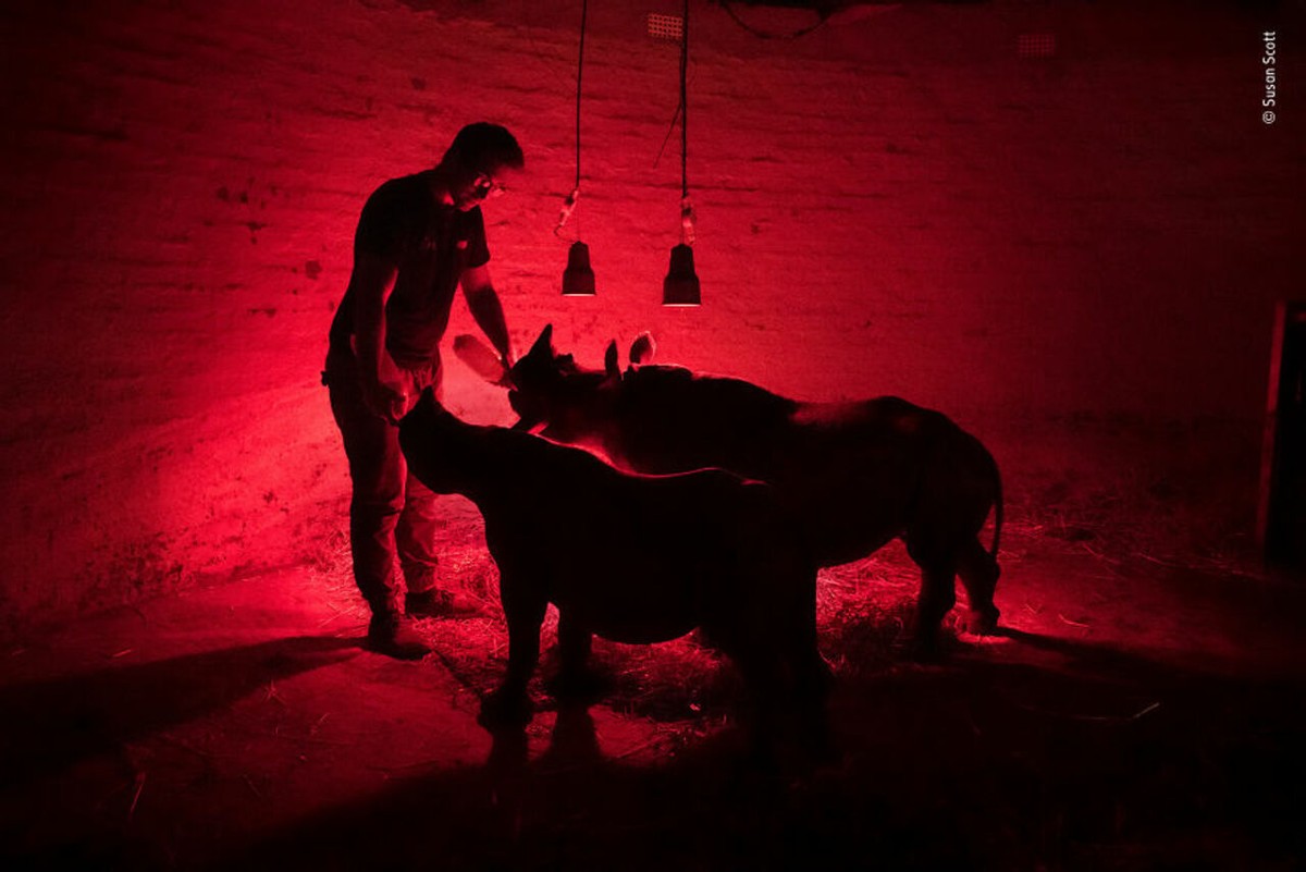 苏珊花了两年时间才说服孤儿院允许她进入--犀牛幼崽和它们的照顾者之间的纽带受到了严格的保护。她悄悄地移动着,小心翼翼地不打扰这两个,南迪和风暴,因为它们是由他们的看护人在红外线灯下喂养的,以最大限度地减少热量损失。对苏珊来说,这张照片是“巨大暴力中的和平时刻”。尽管努力保护黑犀牛,但由于替代医学对其角的需求加剧了偷猎,黑犀牛仍然处于极度濒危状态。苏珊拍照九个月后,孤儿院遭到袭击,看护人员遭到袭击,两只白犀牛被杀。南迪和风暴幸免于难--他们的角被认为太小,不值得麻烦。