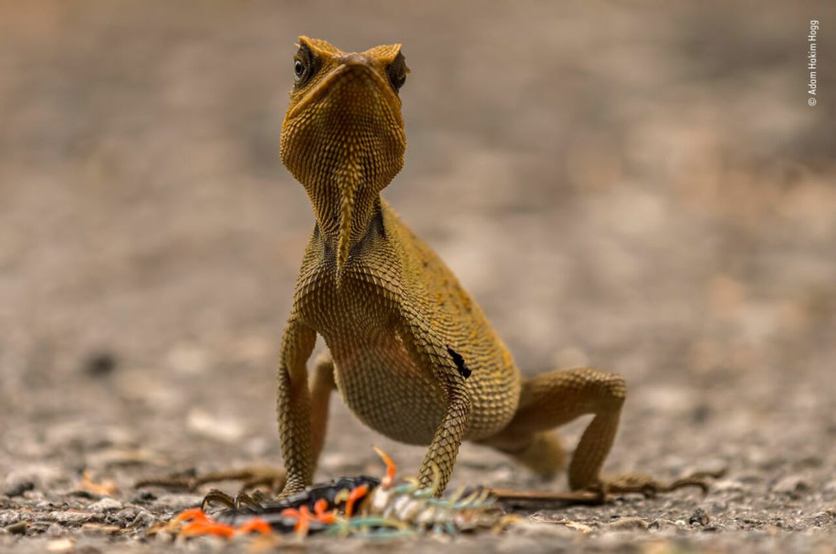亚当神魂颠倒地看着这只树蜥蜴和一只咄咄逼人的马来西亚宝石蜈蚣之间的一场激烈的生死大战。直到战斗结束后,亚当才想起他有相机。他动作迅速,跳进沟里,爬向蜥蜴,寻找这幅齐眼的蜥蜴胜利地站着的肖像。这只蜥蜴眼窝里伸出的角状刺是它俗称的名字--蒂蒂旺萨角树蜥蜴的灵感来源。这些爬行动物深受偷猎者的追捧,他们希望将它们非法出售给宠物贸易。这种做法给蜥蜴造成了巨大的痛苦,并在当地的生态系统中留下了空白。