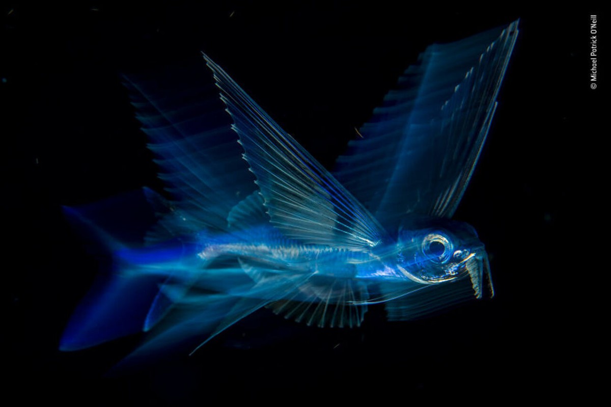一天深夜,迈克尔在深水中跟着一条飞鱼。白天,它们移动得非常快,但晚上它们就在水面下缓慢地游泳。他尝试了各种快门和闪光灯设置,同时一直跟踪他的小主题。“我想创造一种运动感,”他说。通过快速拍打它们分叉的尾巴,像这只幼鱼这样的飞鱼在水中推动自己,直到它们在水面上起飞。通过僵硬地伸出它们的长而尖的胸鳍,它们可以在空中滑翔数百米,远离水下捕食者。