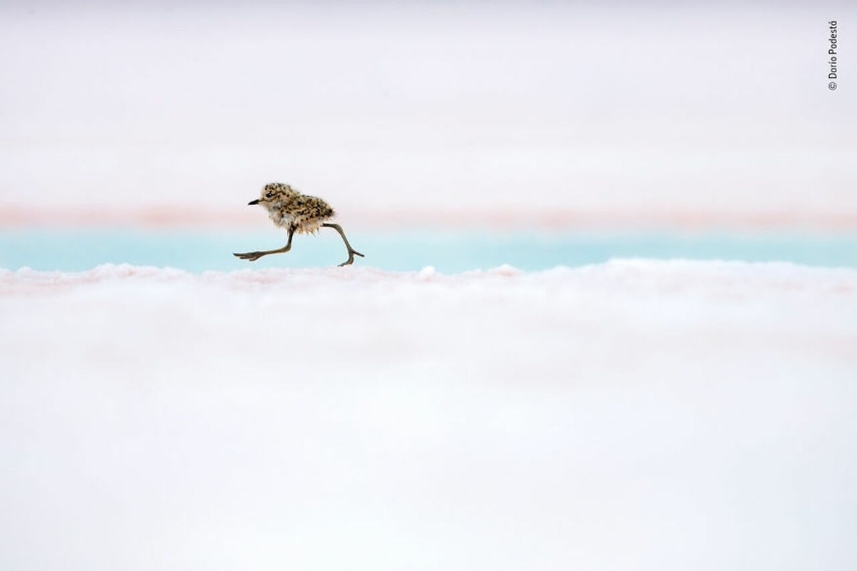 达里奥观察了现场,被“小鸡的脆弱”迷住了,因为它用超大的腿追赶父母。在雨和泥中不舒服地爬过盐田后,达里奥把镜头对准了小鸡斑点的绒毛,将其与盐分和天空的戏剧性背景相映衬。双带鸻小鸡孵化后几乎立即离开巢穴,依靠它们高跷般的腿与父母保持同步,躲避潜在的捕食者。它们的长腿也使它们柔软的羽毛远离潮湿的地面。四五个星期后,它们会长得足够大,可以飞离父母的照顾。