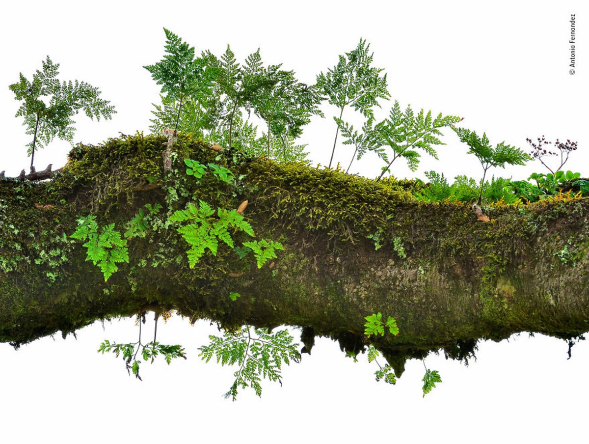 巨大的树枝诡异地挂在森林的薄雾中,其中有一棵挂在蒂洛树上的树枝。安东尼奥说:“这里到处都是蕨类植物,就像森林中的森林一样。”微风搅动了雾气,挫败了安东尼奥对均匀强烈背景的渴望。但后来它掉了下来,他简单的构图在纯白的映衬下显得格外突出。威猛的蒂洛树可达40多米高,只生长在马德拉和加那利群岛。这条树枝上的微型森林大部分是兔脚蕨,有宽阔、细碎的复叶。像其他附生植物一样,它从空气、雨水或植物碎片中吸收水分和养分,并依靠树枝支撑。