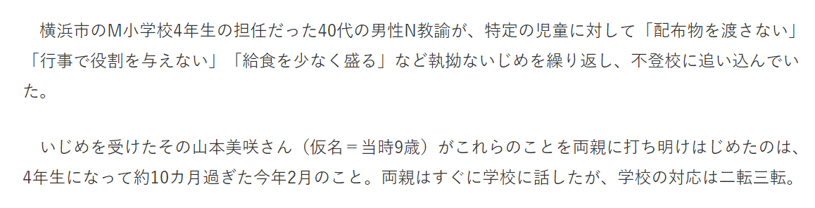 日本横滨市报告过这样一起事件:40岁的班主任欺凌特定的学生,集体活动中忽视他们,不给分配任务,盛饭时不像其他同学一样盛满。