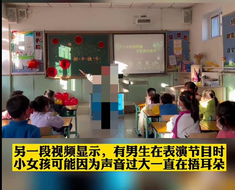 为什么小女孩要被这样批评呢?另一段视频中可以看到,在迎接新年的表演中,一位男生站在旁边朗诵《满江红》,可能因为声音过大,引起了女孩的不适。