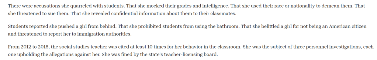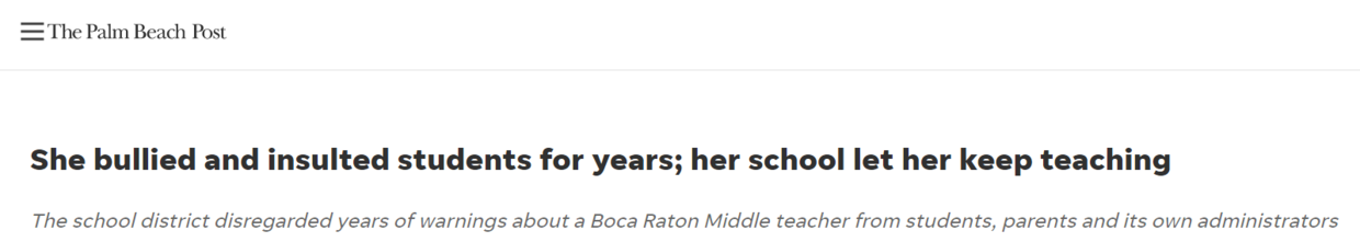 美国最近曝光的一起事件中,佛州一名教师嘲笑学生的成绩和智力,利用种族或国籍来贬低人格,持续十年的时间内反复遭到投诉。