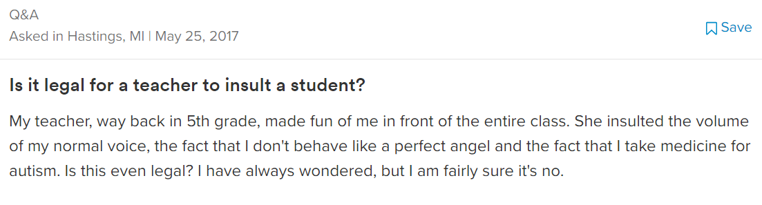 精神上的欺凌很难确定界限,在法律论坛的相关提问中,有学生说到自己一直想了解老师的行为是否合法。