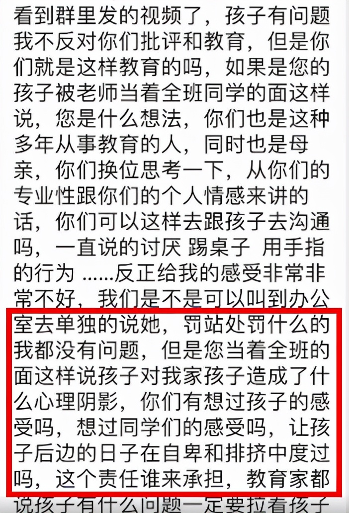 要知道,在视频被发布到网络上之前,首先是被涉事老师发布到了班级群中,有种觉得自己的教育方式很合适,要告知孩子父母的意思。