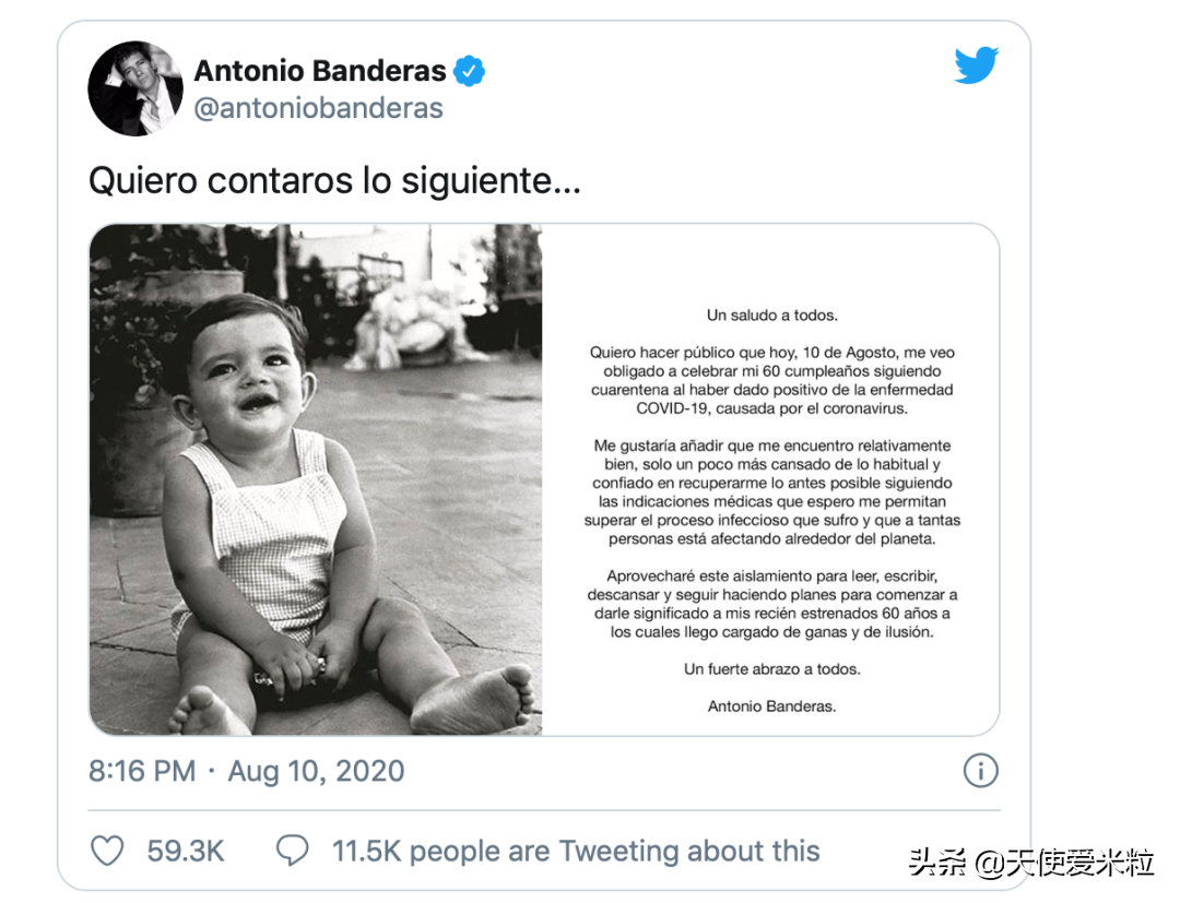 8月10日是永远的拉丁情人、西班牙男星安东尼奥·班德拉斯(antonio banderas)60岁生日,生日那当天他宣布自己罹患新冠肺炎,让全球影迷为他捏了把汗。