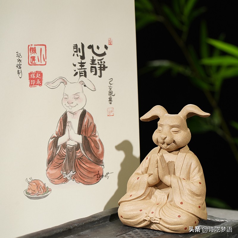 兔者,十二生肖居卯位,以色调表清静淡然之心,内涵与表面合二为一,既寓吉祥,又寓长寿。收敛锋芒,尽露静感,心静则清之意不言而喻。赵永辉先述其意,为表心,也为期待始终如一,静心做事,不为俗事所染。