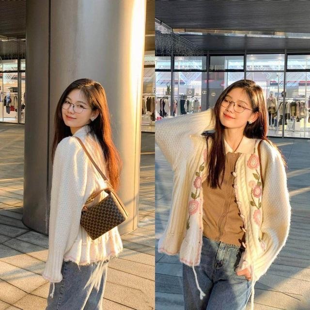 咖啡色针织衫作为内搭,外面搭配米白色印花风的针织开衫,在上半身的搭配上使用叠穿的搭配方式来呈现出层次感,同时将暖色调和基础的米白色结合到一起,既简单干净又不失叠穿搭配的魅力感。