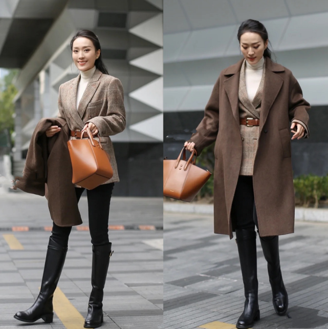 在使用同色系搭配的时候可以同时使用不同的色彩饱和度来呈现出视觉上的丰富感,比如都是咖啡色,但是可以在内外搭配上使用深浅结合的色彩搭配方式来彰显出层次感和丰富感,下半身搭配基础简单的黑色裤子和长靴,低调稳重又显腿长。