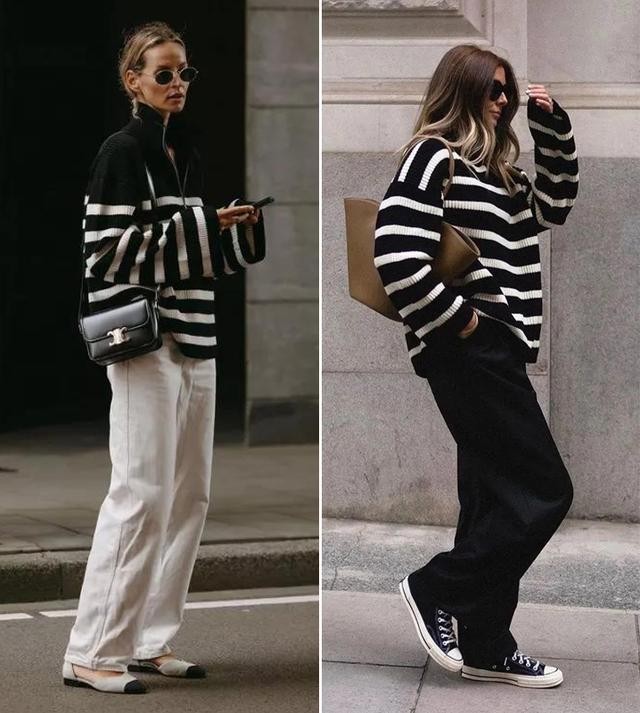 如果你认为单一的纯黑色或者是纯白色搭配显得有些过于寡淡的话,可以尝试使用条纹或者是格纹的设计方式来呈现出更多的丰富感,横向的条纹针织衫搭配上基础的纯色系裤子,既简单低调又可以呈现出视觉上的丰富感。