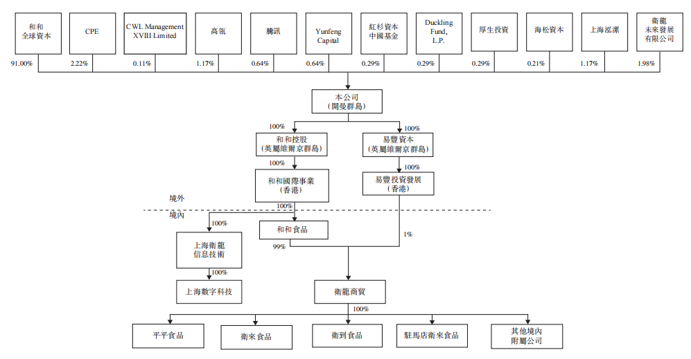 事实上,卫龙是一家典型的家族式企业。据卫龙招股书显示,目前卫龙的最大股东为和和全球资本,持有公司91%的股权,占绝对控制地位,而和和全球资本的最终受益人是卫龙创始人刘卫平、刘福平两兄弟。其余股份则由高瓴、腾讯、红杉资本等机构投资者持有,这些机构投资者均为卫龙在今年3月引入,以当时的投资额估算卫龙的估值就已经达到700亿元。