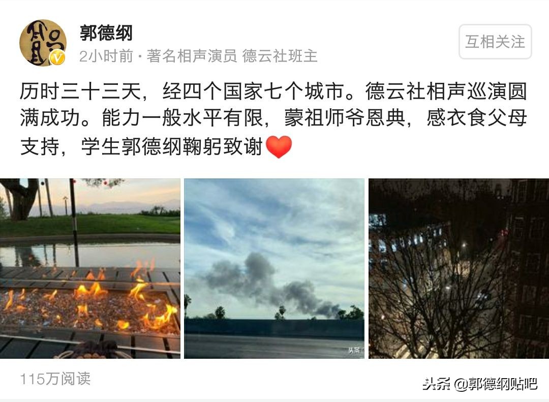 郭德纲于12月3日发布微博宣布巡演圆满成功回国,在微博中他表示:“能力一般水平有限,蒙祖师爷恩典,感衣食父母支持,学生郭德纲鞠躬致谢。”也许正是这种谦虚的态度、奋进的心态,才能取得如此傲人的成绩吧。依然自称“相声界学生”的郭德纲都如此努力,那些“大人、大师”们在忙什么呢?