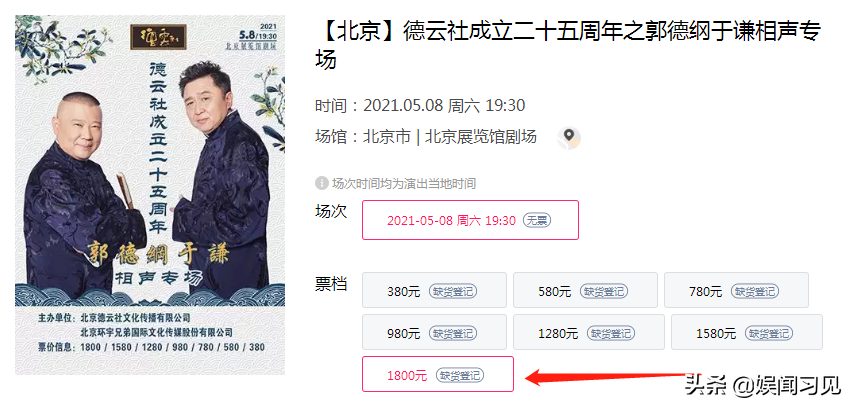 这个演出的时间是定得很早,不过是今天中午十点十八分开始抢票。可惜,小编的手速真的太慢了,虽说售票高达1800元,但还是秒现了“德云灰”,可见郭德纲于谦的票房号召力。也是,但凡有郭德纲于谦坐镇的专场演出,都是秒没。