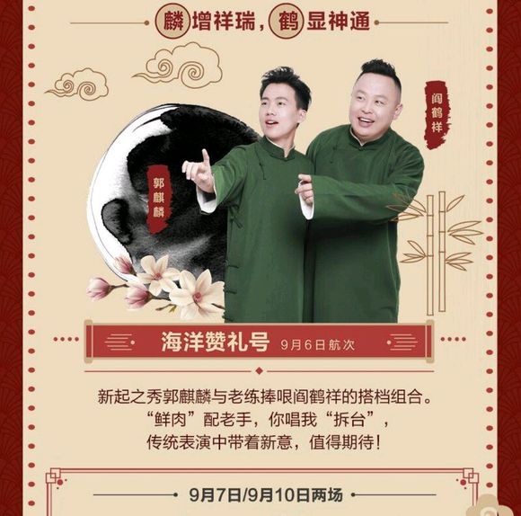 另外,张云雷、杨九郎将于10月23日在辉煌号再办一场相声专场。随着大师兄闫云达的离开,老郭弟子中“大师兄”的席位再度空缺。孙越在场上的现挂“给你找大师兄!就你们家没有大师兄”,熟悉德云社的观众们在会心一笑之余,未免有些唏嘘。