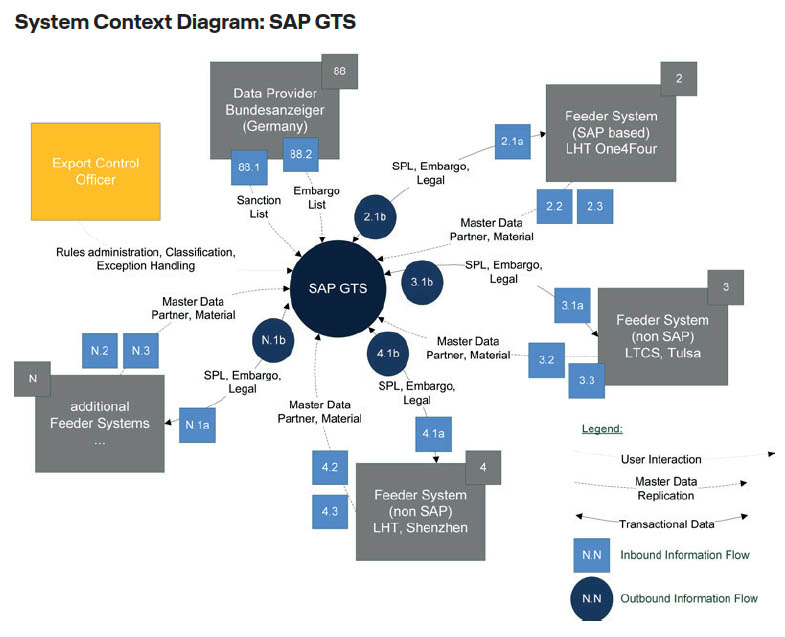 sap的gts,是一个全球贸易服务软件,可以自动执行复杂的进出口流程,将安全合规信息(包括电子清单申报、产品归类、许可证与限制贸易清单筛选、受限制国家等),有效整合进物流程序中,并加快货物的清关流程。