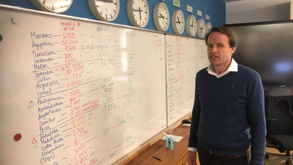 作为德国历史上规模最大的撤侨行动的负责人,蒂尔·克诺恩带领一个50人的团队负责将20万德国人接回家。在白板上,他列出了大约50个国家/地区的名字,分别用红色、绿色和蓝色进行数字标注,那分别代表着有多少德国人滞留在该国、已经接回多少人,还有多少人等待接回。