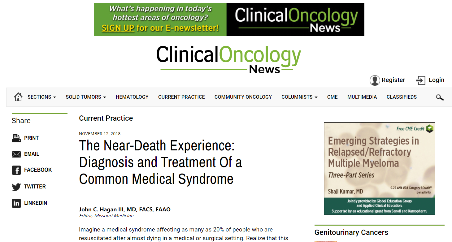 比如2018年11月12日,“clinicaloncology”在线媒体上报道了一个案例,一名48岁的意大利裔美国男子在密苏里州的北堪萨斯城医院接受了剖腹探查术时出现了心脏骤停,经历濒死状态40分钟,结果抢救回来后称他看到了死去的母亲和上帝。