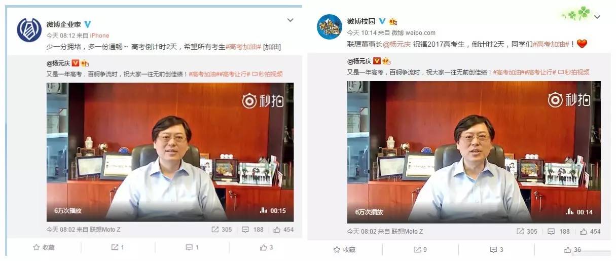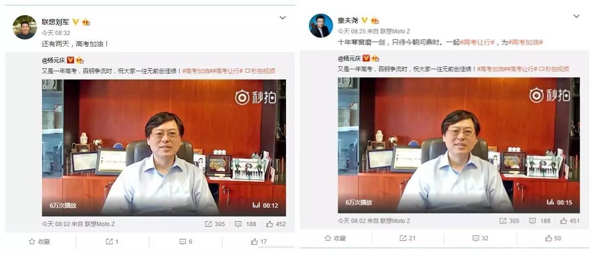 6月5日,联想集团董事长杨元庆发布视频——呼吁大家#高考让行#,一场有温度的公益行动。杨元庆在秒拍视频中,祝贺考生旗开得胜并倡议#高考让行#,联想高管、微博校园以及微博企业家纷纷转载。