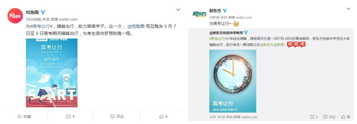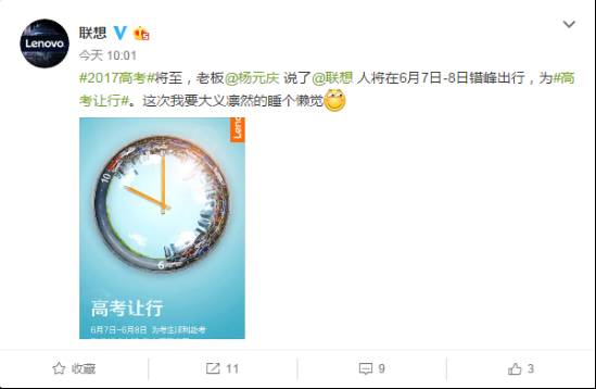 联想的官微也第一时间发布微博跟进:#2017高考#将至,老板@杨元庆 说@联想 人将在6月7日~8日错峰出行,为#高考让行#。这次我要大义凛然地睡个懒觉。目前#高考让行#成为了微博热门话题,阅读量达73万+。